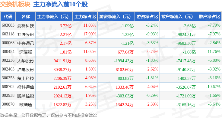 从资金流向上来看,当日交换机板块主力资金净流入10.33亿元,游资资金净流出2.67亿元,散户资金净流出7.66亿元。交换机板块个股资金流向见下表: